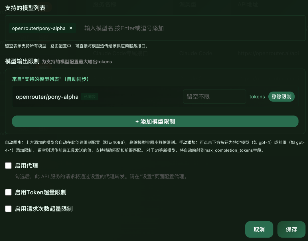 点击“Claude Code专属接口”右侧的“编辑”按钮,在打开的表单中,往下拉,找到“支持的模型列表”,并在里面输入 openrouter/pony-alpha ,并按键盘回车键,然后继续往下拉,点击“保存”。