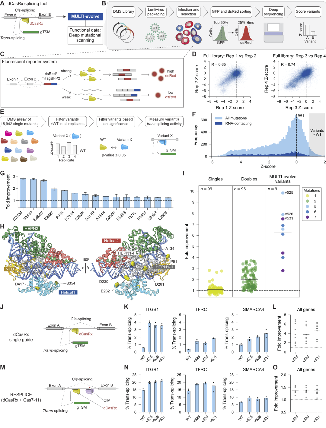 图4:利用MULTI-evolve优化基于dCasRx的RNA剪接工具。