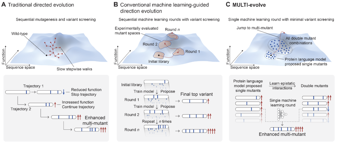蛋白工程的核心挑战在于需要在高维序列空间中寻找能够协同增强功能的多突变组合。传统定向进化通常通过逐步叠加突变进行搜索,而机器学习方法又往往依赖大规模数据、多轮实验或昂贵的基因合成。研究人员提出了 MULTI-evolve 框架,通过结合蛋白语言模型、上位性建模以及高效多位点突变构建技术,实现端到端的快速蛋白进化。该方法能够预测具有协同效应的多突变组合,并通过优化的MULTI-assembly方法高效合成候选序列。在三个不同蛋白体系中,该框架仅需一次机器学习引导的进化循环即可实现最高约10倍改进,并在某些情况下获得更高数量级提升。整体而言,该方法提供了一种通用、高效的多突变蛋白工程策略。