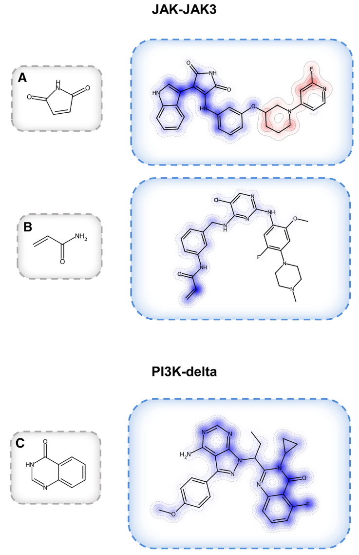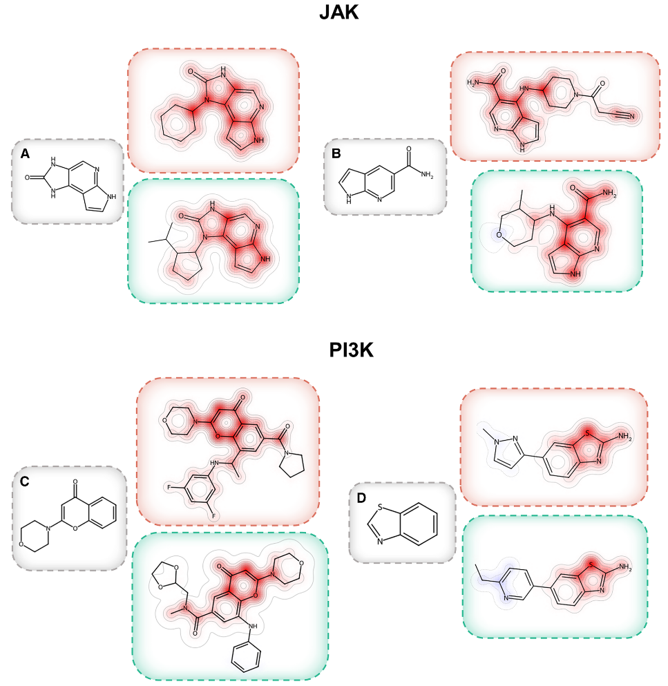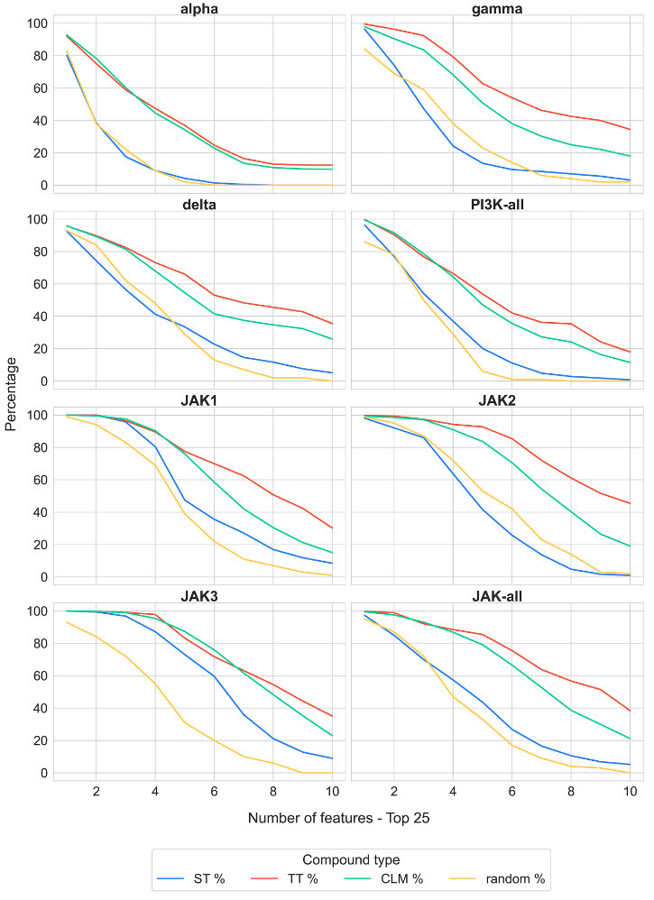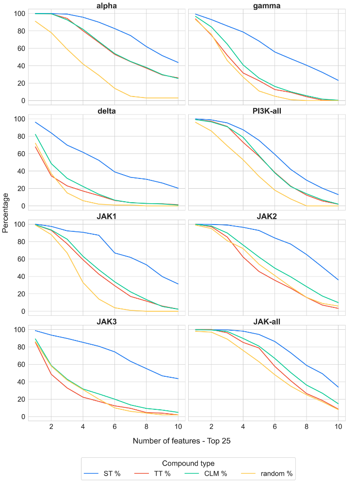 作者利用化合物结构表示构建了平衡随机森林(BRF)分类模型,以区分ST-CPD与TT-CPD。如图2所示,针对PI3K和JAK三联体的所有模型变体在测试集上的准确率均超过80%,且MCC始终保持在约0.65–0.90的较高水平。这些结果证实了ST-CPD与TT-CPD之间确实存在可区分的结构特征,并表明数据稀疏性并未对结果产生显著影响。值得注意的是,将所有ST-CPD合并后与TT-CPD进行比较的BRF模型通常表现出略低的分类准确率(尤其是在PI3K数据集中),这提示与单个靶点相关的ST-CPD可能包含各自独特的结构特征。