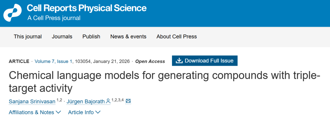 针对上述局限性,波恩大学的Sanjana Srinivasan与Jürgen Bajorath于2026年1月9日在《Cell Reports Physical Science》上发表研究型论文,题为“Chemical language models for generating compounds with triple-target activity”。