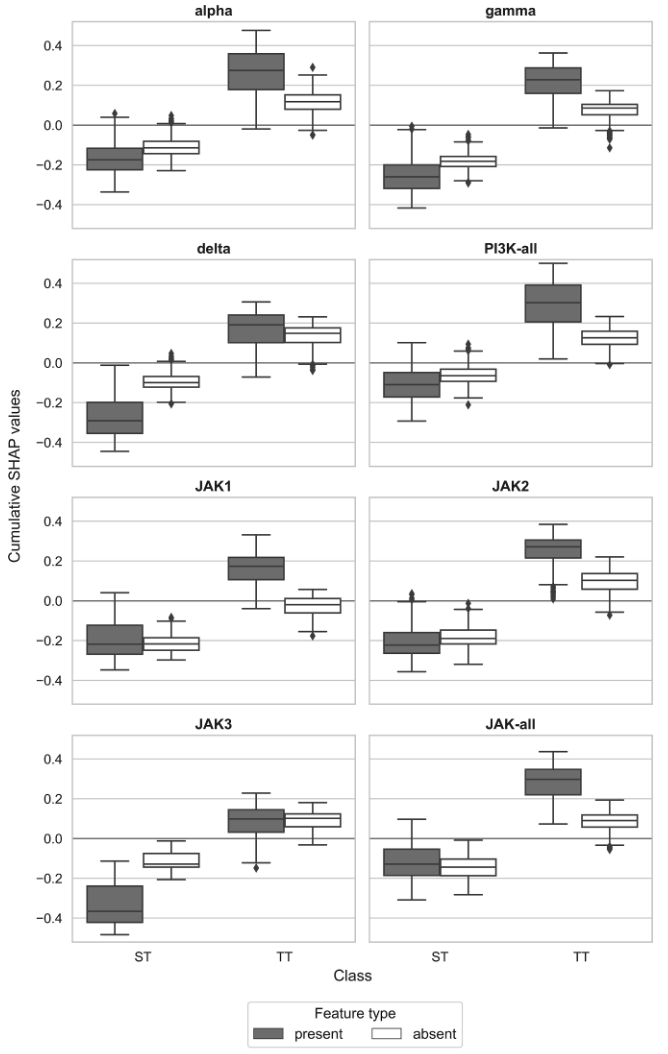 在第一步中,作者对所有被分类模型正确预测的测试集ST-CPD与TT-CPD进行了全局SHAP分析。具体而言,通过分别对测试化合物中存在或不存在的特征的单个SHAP值进行求和,计算累积SHAP值,从而能够识别在整个测试集中主导预测结果的关键特征。如图4所示,存在于TT-CPD与ST-CPD中的特征通常对其正确预测作出幅度相当的贡献(分别对应正值和负值)。相比之下,TT-CPD与ST-CPD中缺失的特征所作出的贡献幅度通常较小,仅在少数情况下略有偏离(接近于零)。对于使用所有ST-CPD并集构建的分类模型而言,正确预测主要由存在于TT-CPD中的特征所驱动。综合来看,这些结果证实了在两个靶点三联体中,TT-CPD以及各单一靶点对应的ST-CPD均具有各自特征性的结构特征。