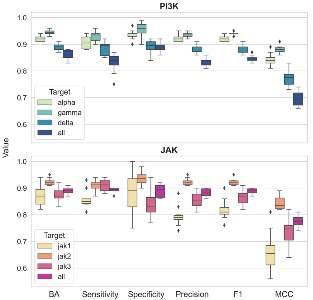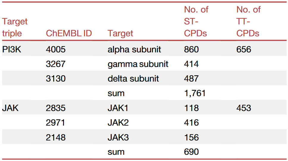 首先,在ChEMBL数据库中系统性地搜索了TT-CPD。共获得493组至少包含50个TT-CPD的靶点三联体,涉及146个不同靶点和11195个唯一的TT-CPD。在这493组靶点三联体中,仅有15组包含来自不同蛋白家族的靶点。用于后续分析时,从PI3K家族和JAK家族中选择了两组由相关蛋白激酶靶点构成的三联体,这两组靶点三联体分别拥有最多的已知TT-CPD,数量为656个和453个(表1)。对于每一组靶点三联体,相应的单靶点化合物(ST-CPD)被整理为四个集合,包括针对每一个单独靶点的子集,以及所有ST-CPD的并集(“all”)。