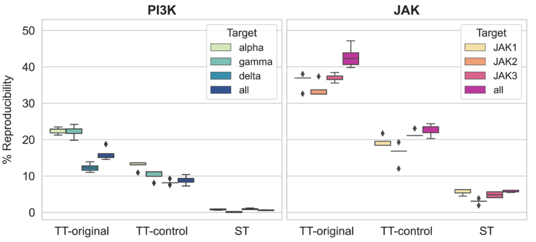 使用原始预训练的DT-CPD Transformer以及对照模型对ST-/TT-CPD配对数据进行微调,并随后采样候选TT-CPD。如图3所示,基于原始预训练Transformer的微调模型(TT-original)在测试集上实现的TT-CPD最大再现率分别超过20%(PI3K)和40%(JAK)。对照模型(TT-control)的TT-CPD再现率显著降低,这是因为其预训练阶段未包含TT-CPD,从而避免了化合物记忆效应。尽管如此,对照模型在微调后仍分别达到了超过10%(PI3K)和20%(JAK)的最大测试TT-CPD再现率。此外,原始模型(ST)在预训练阶段数据中(包括记忆效应)再现ST-CPD的比例非常低,PI3K接近0%,JAK约为5%。