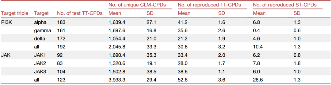 基于Mann–Whitney U检验并结合Bonferroni多重检验校正,所有观察到的TT-CPD再现率差异,以及TT-CPD与ST-CPD之间的再现率差异,均具有统计学显著性。表2总结了在五次独立微调实验中,所采样的候选化合物及成功再现的测试集化合物的平均数量。