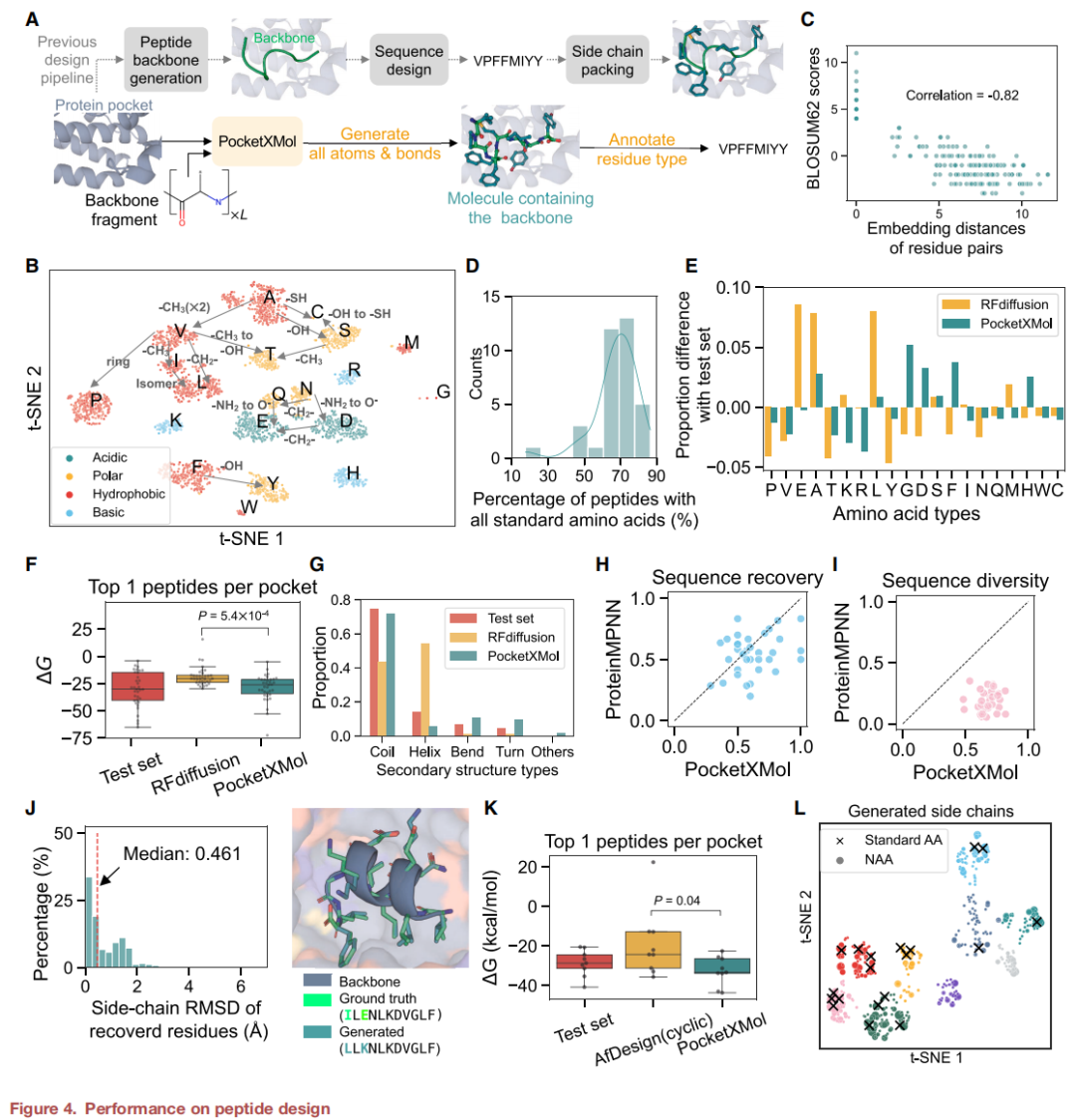 1. 小分子相关任务:从设计到优化的全链条 基于结构药物设计(SBDD) :在100个基准口袋的评估中,14项指标(涵盖分子成药性、2D拓扑、3D保真度)中11项排名第一。生成分子中35.37%同时满足“Vina得分优于参考分子+3D结构有效”,远超第二名的20.54%(p=4.9×10⁻²⁴)(图2B)。即使输入AlphaFold预测口袋、Rosetta重排侧链口袋等非天然结构,性能依然稳定;3D分子生成 :生成分子的原子间距离分布与真实药物分子高度吻合,2D/3D结构有效率显著高于MolDiff、GeoLDM等基线模型,且支持体积形状约束生成,可精准匹配预设分子拓扑(图2D);片段连接与PROTAC设计 :在DiffLinker数据集上,2D/3D结构恢复率、与参考分子相似度均排名第一(图2E和2F);PROTAC设计中,固定片段构象时有效分子比例达59.60%(DiffLinker为34.03%)(图2G),未固定构象时达56.88%(LinkerNet仅6.99%)(图2H);分子优化 :针对LogP值优化任务,100个测试分子经3轮迭代后快速收敛至目标值(1.8),优化后误差显著低于初始值(p=6.12×10⁻²⁰),且保持分子结构相似度(图2J)。2. 多肽相关任务:从线性到环肽的全类型覆盖 线性肽设计 :在PepBDB测试集中,生成肽的氨基酸分布与测试集吻合度(Jensen-Shannon divergence=0.16)优于RFdiffusion pipeline(0.23),Rosetta结合能更低(p<0.05),二级结构分布更贴近天然肽(图4D-G);肽逆折叠 :序列恢复率达61.7%(ProteinMPNN为54.4%,p=0.02),序列多样性显著更高(p=3.18×10⁻²⁴),侧链构象RMSD中位数仅1.1Å,与真实结构高度一致(图4H-J);环肽设计 :在26个蛋白-环肽复合物测试中,Top1/Top10 Rosetta结合能优于AfDesign(cyclic),骨架RMSD和二级结构组成表现相当(图4K);非标准氨基酸(NAA)设计 :天然支持NAA生成,共识别出454种独特NAA侧链,其Rosetta结合能与标准氨基酸相当或更优,为多肽药物的理化性质优化提供了新途径(图4L)。图4. 肽设计性能。(A) PocketXMol与传统肽设计流程的差异。(B) BLOSUM62得分与氨基酸嵌入距离之间的关系。(C) 氨基酸嵌入的t分布随机邻域嵌入可视化。(D) 测试集中每个口袋由标准氨基酸组成的肽的百分比。(E) 生成的肽与测试集之间氨基酸组成的差异。(F) 蛋白质-肽复合物的Rosetta结合能分布。p值使用单侧配对t检验计算,n = 35。箱线图显示了四分位数和1.5 × 四分位距。(G) 不同方法生成的肽的二级结构比例。(H 和 I) 在逆折叠任务中,ProteinMPNN和PocketXMol的序列恢复率 (H) 和序列多样性 (I)。(J) 在逆折叠中,由PocketXMol恢复了氨基酸类型的侧链原子的均方根偏差分布(左图)及一个示例(右图)。(K) 环状肽设计的Rosetta结合能分布。p值使用单侧配对t检验计算 (n = 9)。箱线图显示了四分位数和1.5 × 四分位距。(L) PocketXMol生成的侧链嵌入的t分布随机邻域嵌入可视化。圆圈大小代表生成数量,颜色代表聚类。