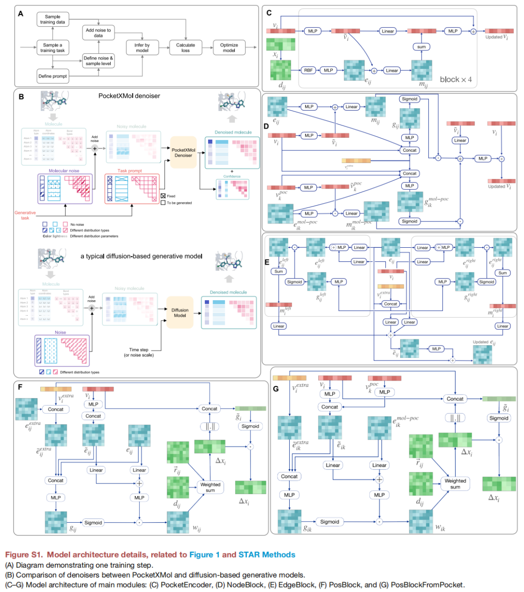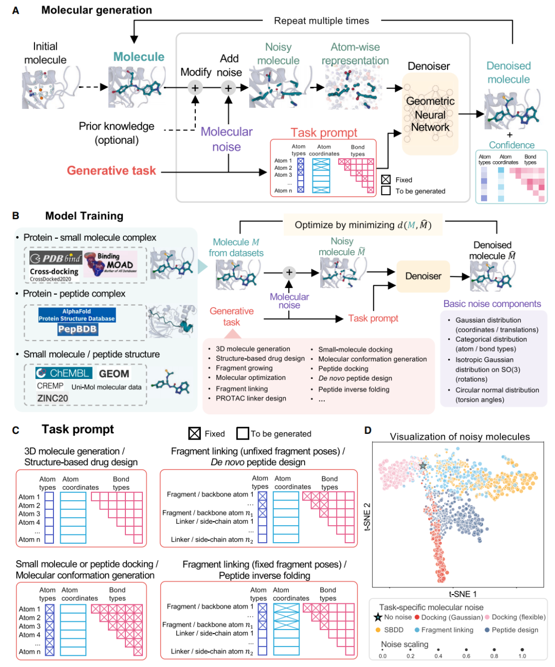 图1. PocketXMol框架。(A) 生成流程示意图。(B) 训练过程。PocketXMol采用通用去噪框架来整合来自多种分子类型的结构数据。(C) 典型任务的任务提示。(D) 具有不同任务特定噪声的带噪声分子的t分布随机邻域嵌入可视化。