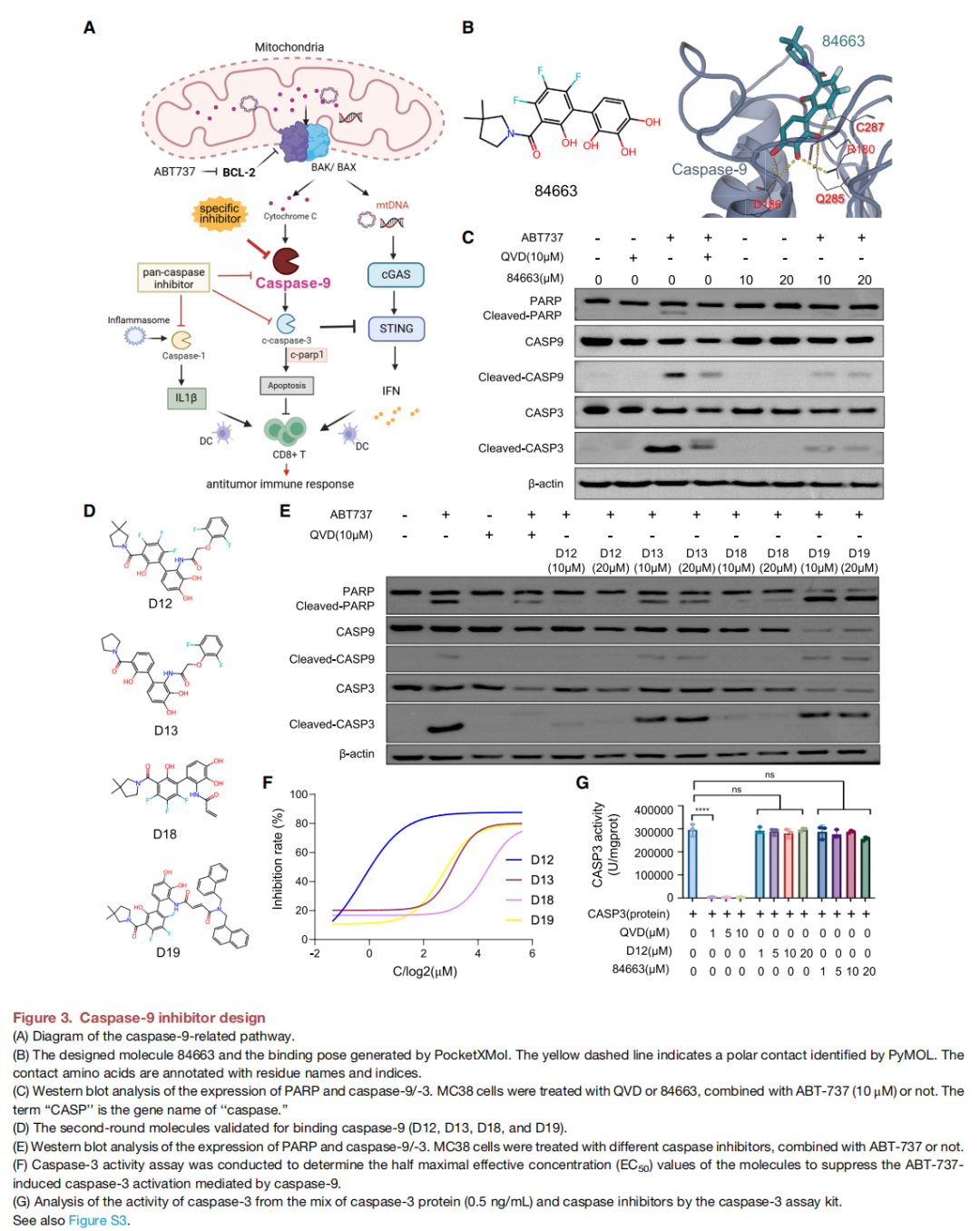 小分子对接 :在PoseBusters v1(428个复合物)中,RMSD<2Å的构象比例达83.4%(调优排序),仅次于AlphaFold 3(已知口袋);PoseBusters v2(308个复合物)中表现与AlphaFold 3相当(84.4%),且79.4%的构象同时满足“RMSD<2Å+PB-valid”,结构有效性突出(图6A-G);多肽对接 :在PepBDB 79个复合物测试中,平均DockQ达0.58(调优排序), oracle排序下达0.73,显著优于AlphaFold-Multimer(0.43)和FlexPepDock(0.30),且支持含NAA多肽的精准对接(13个测试样本中13个DockQ≥0.49);酶-底物识别 :在卤化酶、糖基转移酶等4类酶家族中,对接置信度得分的AUROC均值达0.68,显著高于AlphaFold 3(0.56)(图6J、6K),结合神经网络隐藏表征训练的逻辑回归模型后,AUROC进一步提升5.9%-51.9%;虚拟筛选 :在DEKOIS 2.0基准中,ROC_AUC中位数达0.787,与当KarmaDock(0.786)相当,无需任务微调即可实现高效筛选。三、临床前验证:从计算设计到生物活性的闭环 1. Caspase-9抑制剂:特异性与活性比肩商用药物 Caspase-9是肿瘤内在凋亡通路的关键靶点,现有泛caspase抑制剂缺乏亚型特异性。研究团队用PocketXMol设计了16个小分子抑制剂,经优化后获得4个高活性分子(D12、D13、D18、D19):