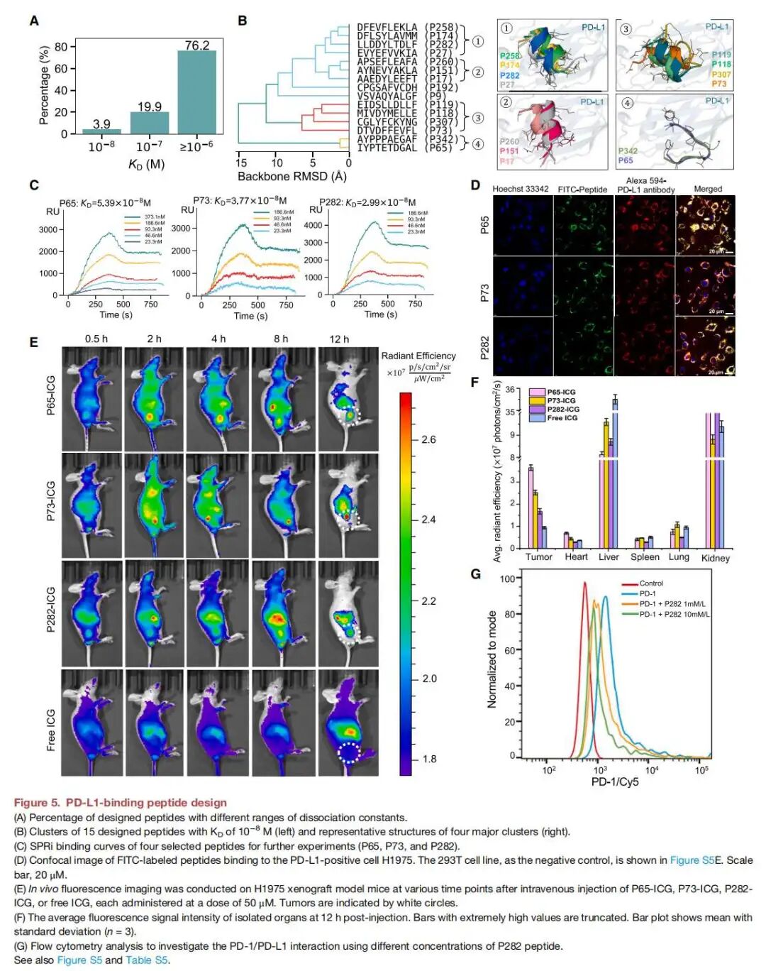 生物活性 :D12能有效抑制ABT-737诱导的caspase-9激活,下游caspase-3/PARP1切割抑制效果与商用抑制剂QVD-OPh、Z-LEHD-FMK TFA相当;特异性 :不直接抑制caspase-3(与QVD-OPh不同),SPR实验显示C287A突变后结合亲和力下降30倍,验证了预测结合位点的准确性;可开发性 :设计分子与已知caspase抑制剂相似度低,无近缘匹配的商用化合物,为新结构类型抑制剂研发提供了基础。2. PD-L1靶向肽:高亲和力与体内肿瘤靶向性验证 PD-L1是免疫治疗的核心靶点,PocketXMol设计的10残基肽展现出优异的靶向性能:
