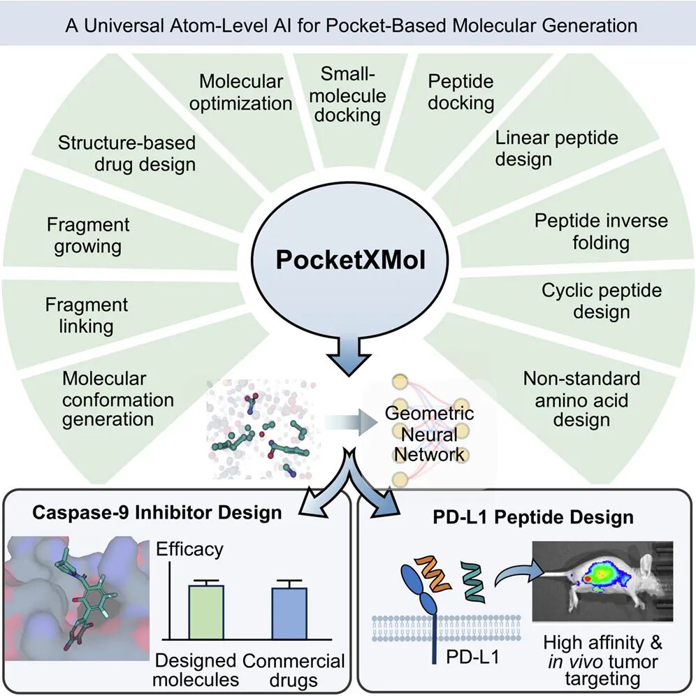 在基于结构药物研发(SBDD)领域,分子生成、对接预测、多肽设计等核心任务长期依赖专用算法,跨任务迁移性差、分子表征不统一、任务定义模糊等瓶颈严重制约研发效率。近日,清华大学团队等在《Cell 》发表的题为“Unified modeling of 3D molecular generation via atomic interactions with PocketXMol”的研究,提出了一种原子级通用生成AI模型 PocketXMol ,通过三大核心创新实现了13类分子任务的统一建模,11项任务达到当前最优性能,并完成从小分子抑制剂到多肽探针的临床前验证 ,为AI药物研发带来范式级工具。