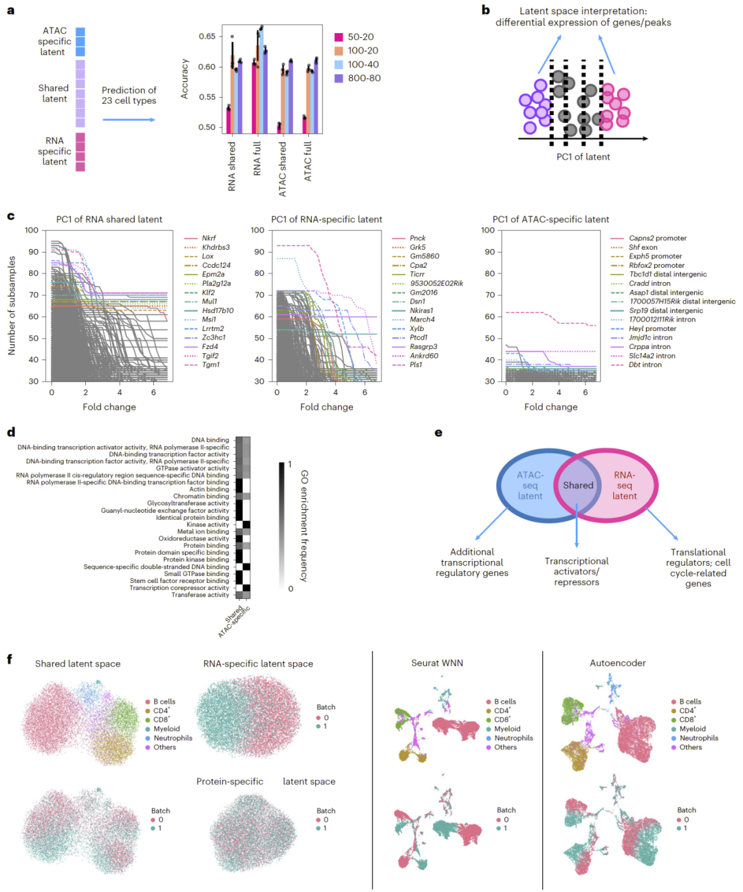 在 SHARE-seq 数据中,APOLLO 成功区分了同时由 RNA 与 ATAC 捕捉到的基因活性信息,以及仅由其中一种模态捕捉的调控信息。将 RNA 特异潜在空间加入分类模型后,细胞类型预测准确率明显提升,说明特异潜在空间确实包含生物学相关信息。