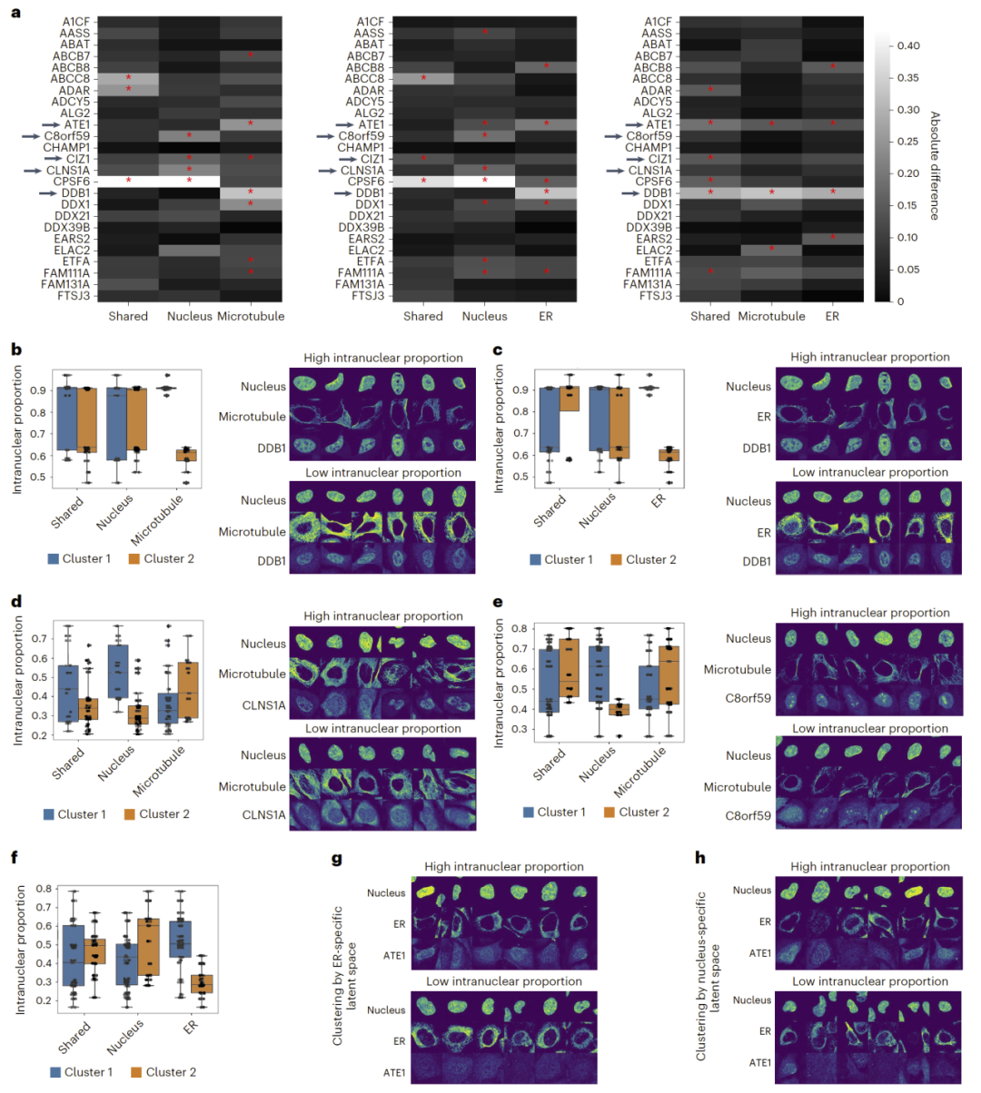 通过对潜在空间进行主成分分析,研究人员识别出共享与特异潜在空间所对应的形态特征。例如,异染色质体积这一与衰老和神经退行性疾病相关的特征,仅存在于共享潜在空间中;而 γH2AX 焦点数量则主要存在于蛋白特异潜在空间中。