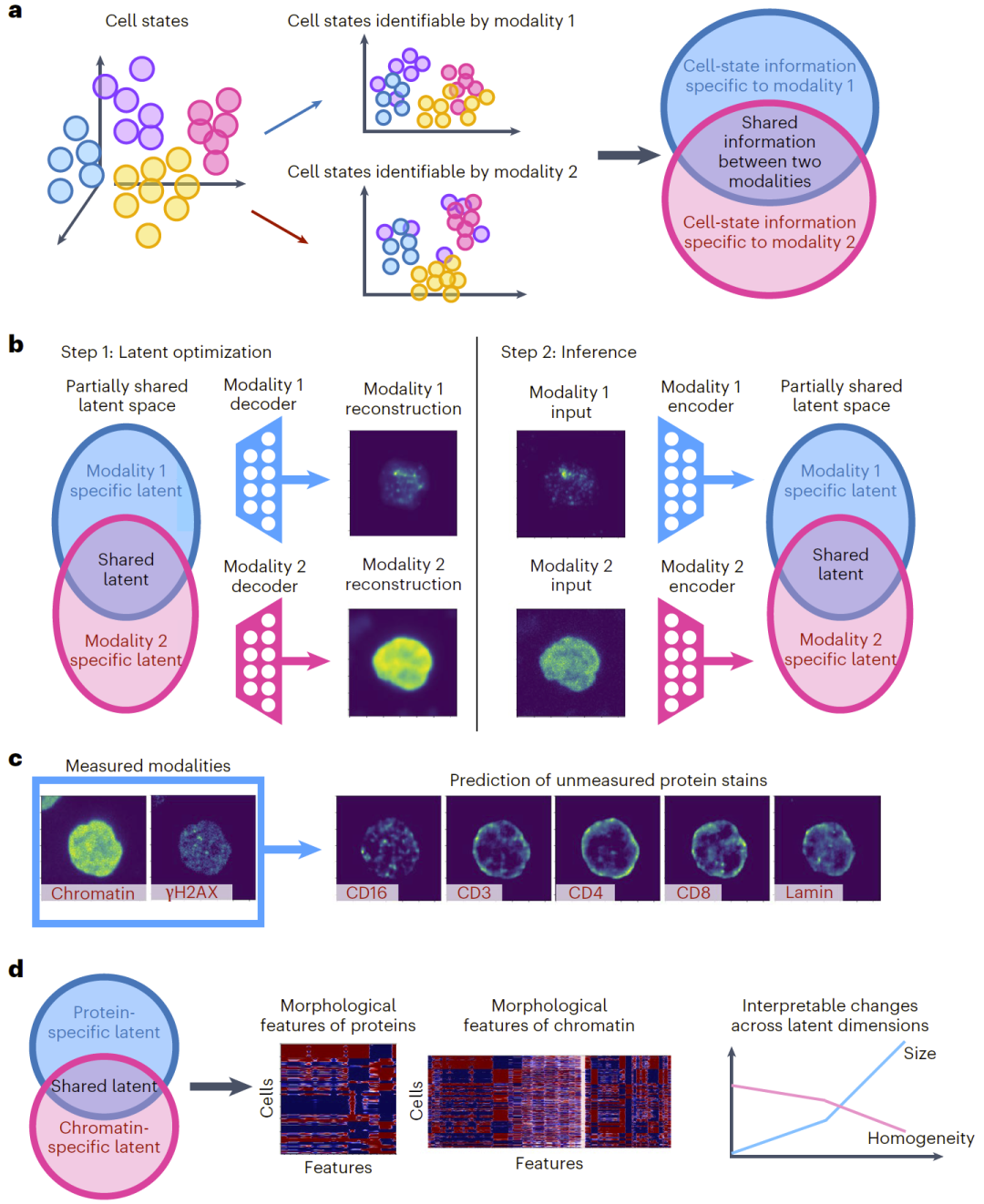 不同实验技术能够从转录组、染色质结构、蛋白丰度及亚细胞形态等多个角度刻画细胞状态。然而,真实的细胞状态是不可直接观测的,其物理、转录与功能状态之间往往存在部分共享的信息,也存在仅在某一模态中才能捕捉到的特异信息。传统方法要么分别分析不同模态并事后比较结果,要么学习统一的整合嵌入表示,但后者通常将共享信息与特异信息混合在同一潜在空间中,导致难以解释不同模态对表型的独立贡献。