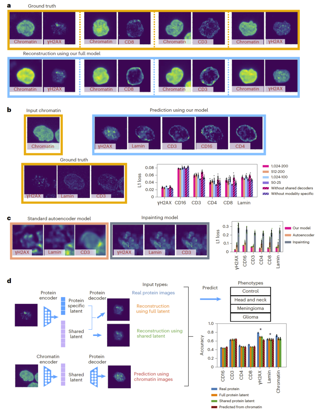 进一步分析显示,由染色质预测得到的蛋白图像在疾病分类任务中的表现与真实蛋白图像相当,说明共享潜在空间确实捕捉到了与疾病相关的生物学信息。
