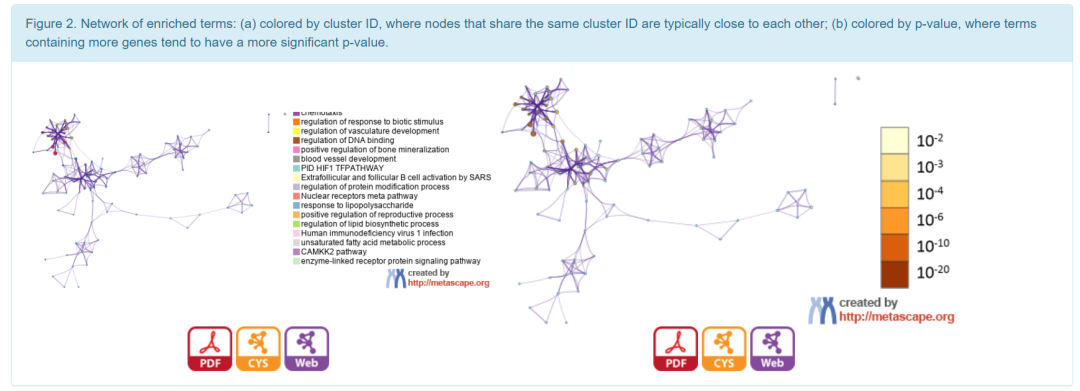 为了展示通路间的关系,Metascape 将富集结果网络化。如果两个通路包含很多相同的基因,它们就会连在一起,形成功能模块。这种展示方式比单纯的列表更利于理解生物过程之间的内在联系。