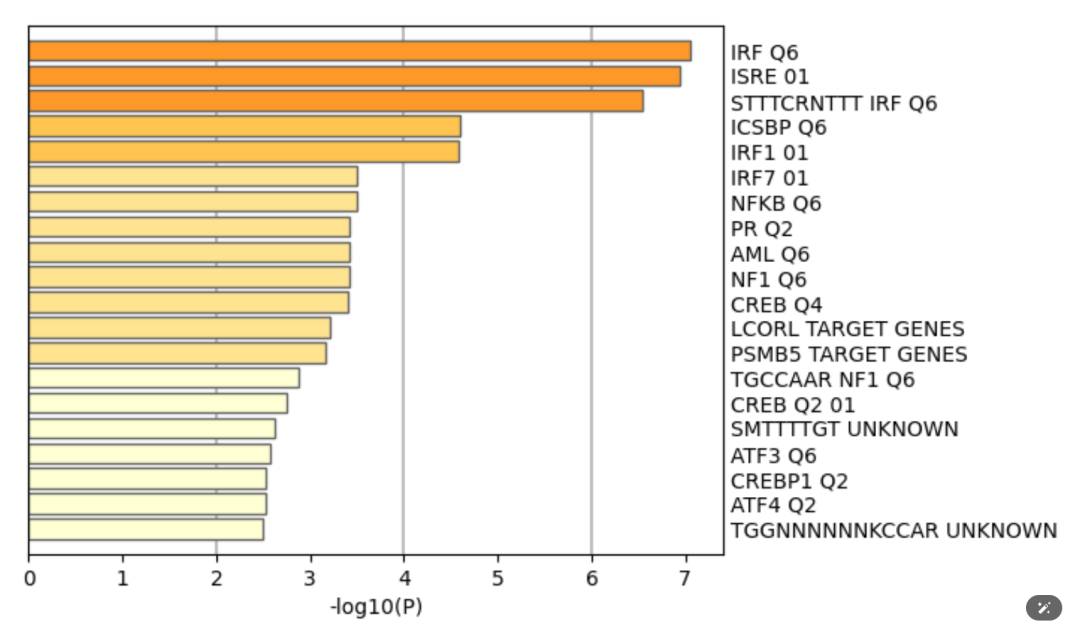 该图表展示了基于转录因子结合位点(Motif)的富集分析结果, 此图表的数据源自 MSigDB (Molecular Signatures Database) 中的 C3: TFT (Transcription Factor Targets) 子集。这是一个专门基于计算生物学预测的基因集,与 Figure 7 TRRUST 基于文献证据不同,这一分析侧重于基因组序列特征。它分析基因列表中的基因启动子区域是否共享特定的 DNA 序列模式(即转录因子结合基序)。