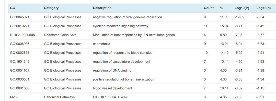 左表是对完整网络的富集,右表是对MCODE子网络的富集结果。