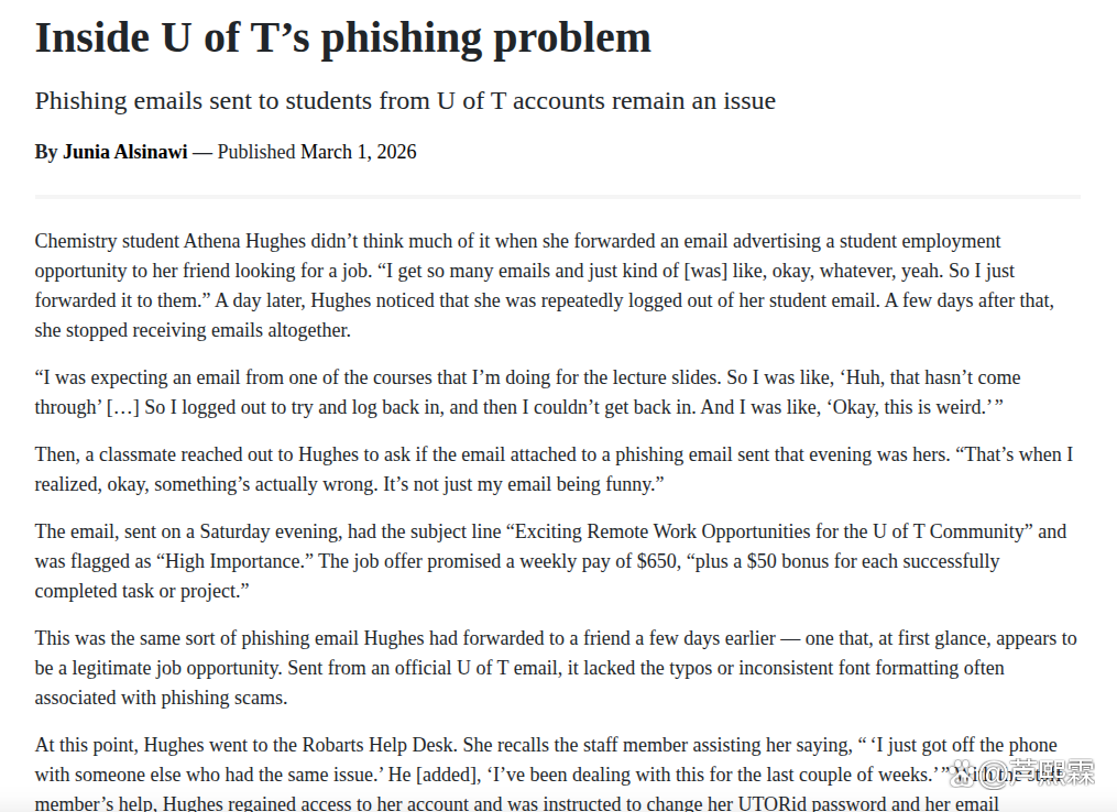 在数字化校园建设全面深化的背景下,高等教育机构的信息系统已成为支撑教学、科研与管理运行的核心神经中枢。然而,这种高度的互联互通性也使其暴露于日益严峻的网络安全威胁之下。其中,网络钓鱼(Phishing)作为一种成本低廉却极具破坏力的攻击手段,始终占据高校安全事件的首位。2026年初,多伦多大学(U of T)遭遇的一系列针对性钓鱼攻击事件,再次将学术界的安全脆弱性推至风口浪尖。据《The Varsity》报道,该校师生频繁收到伪装成教务处、财务部及科研管理平台的恶意邮件,导致多起凭证泄露与数据渗出事件。这一现象并非孤例,而是全球高校面临共性危机的缩影。