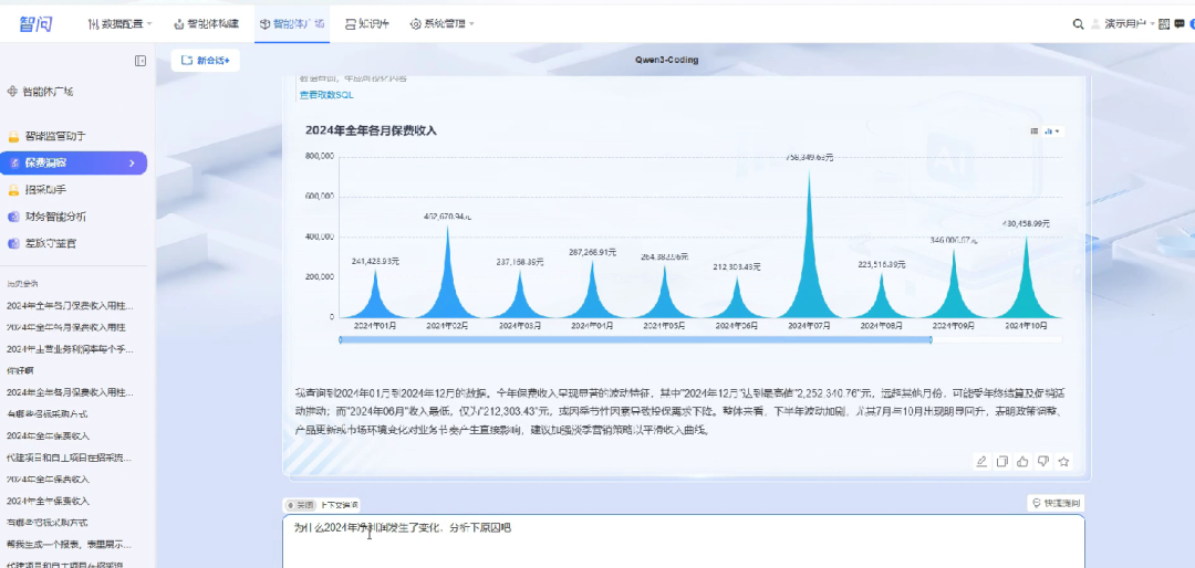 “上月保费收入趋势如何”、“理赔率突增的原因是什么”——这种带归因逻辑的问题,它也能处理,不只是查个数字出来。你懂我意思吗,这才是真正听懂了业务人员在问什么。