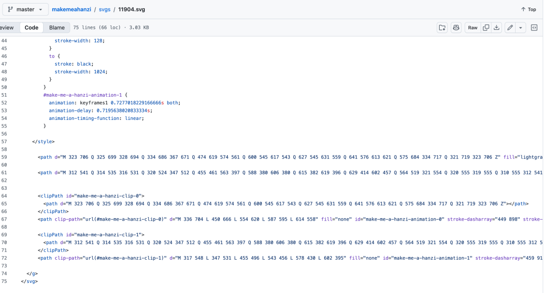 而我们上文提到的笔顺库,则是把这个矢量图中的笔画按顺序排列,得到一个数据库: