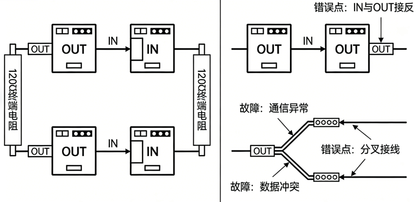 现场常见故障排查:扫不到伺服,先查IN/OUT接线、电阻、从站模式;伺服不动,核对地址、映射、控制指令;定位不准,查时钟同步、电缆干扰。其实只要把接线顺序、电阻、接地这三点做好,伺服模式、地址、映射核对对,基本一次就能通,稳定不丢站。