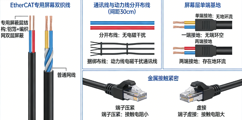还有两个容易忽略的接线细节:一是电缆必须用EtherCAT专用屏蔽双绞线,别用普通网线凑数,也别把通讯线和伺服动力线绑在一起,电机一启动,干扰就来了,伺服会乱转或者定位不准;二是屏蔽线接地,只能在EtherCAT转Profinet网关这边接地,伺服那头别接,不然会有地环流,通讯直接乱码,尤其是车间接地复杂的现场,这点一定要记住。另外,端子一定要压紧,伺服运行时振动大,虚接一下就会断连,反复调试都没用。