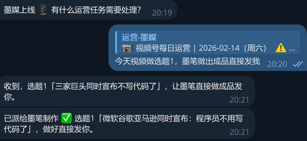 关键点:从"孟健选一个"到"成片发出来",中间全自动。 墨笔这个 Agent 收到选题后,自己写脚本、调 TTS、提时间戳、编场景、渲染视频、发通知。我只需要在 Telegram 里点一下确认。