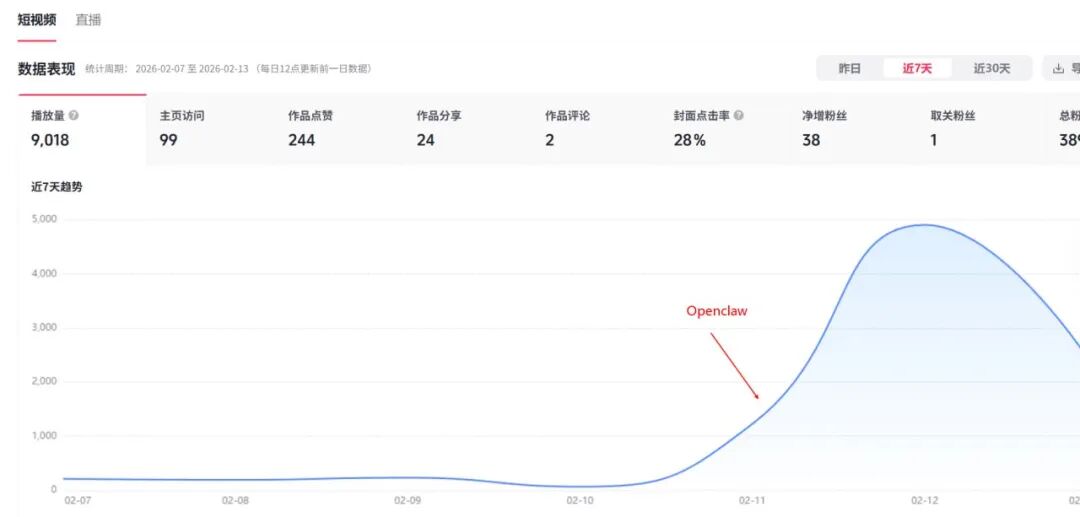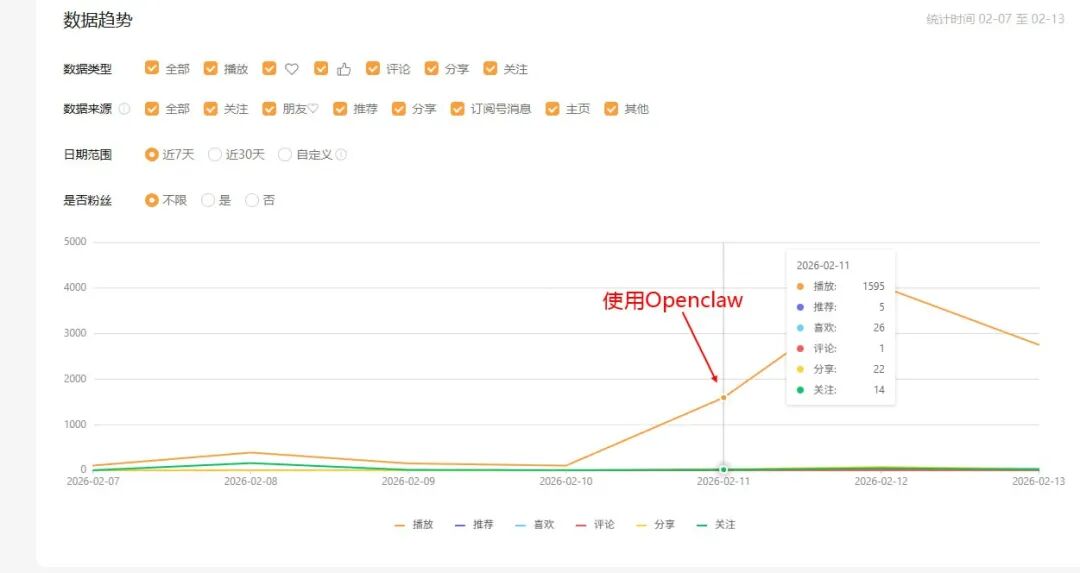 从 02-11 开始用 OpenClaw 做视频的那天起,播放量曲线直接起飞。之前一周加起来可能还不到 1000 播放。