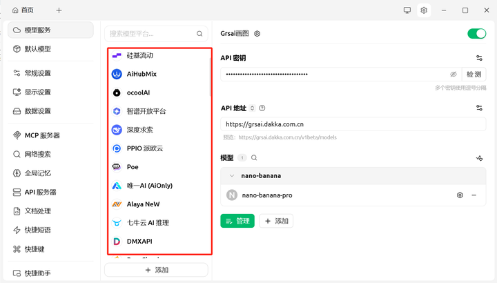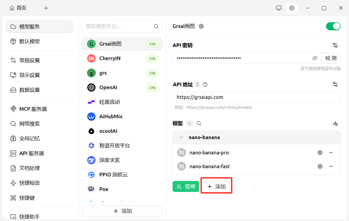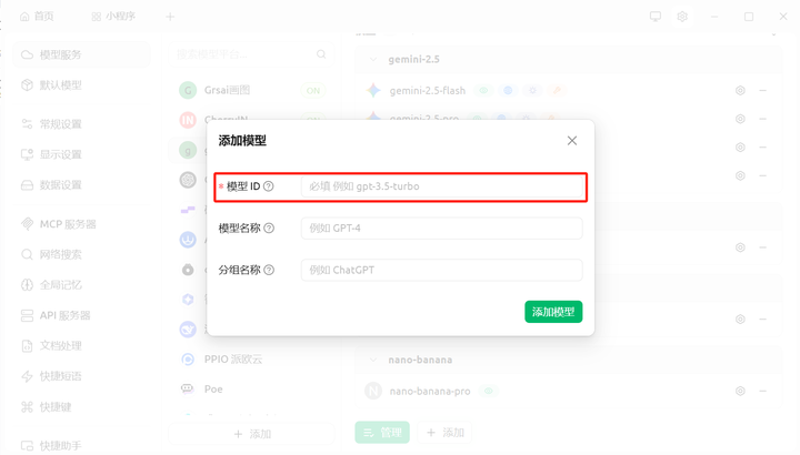 2.添加模型服务:在设置菜单中,找到并点击“模型服务”点击添加,输入供应商名称(自定义随意写),模型提供商OpenAI 和 Gemini 都支持。