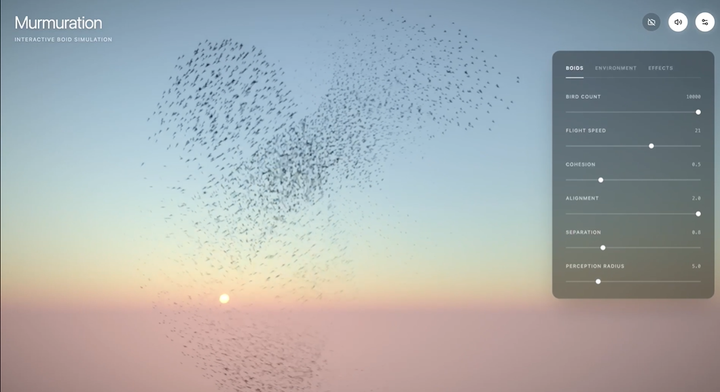 Gemini 3.1 Pro 能生成复杂的 3D 椋鸟群舞动画,打造沉浸式体验。它基于3D算法模拟椋鸟群飞,用户可通过手部追踪技术实时操控鸟群飞行方向与轨迹。鸟群运动时,系统还会同步生成动态配乐,将视觉与听觉融合,为交互设计与创意编程提供了高效的原型验证。