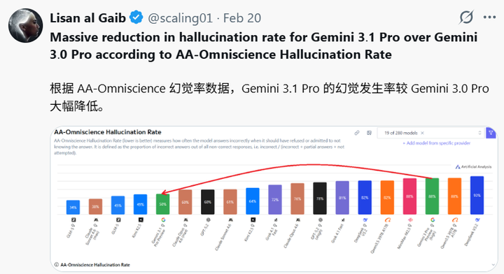 AA-Omniscience Index 跃升:该指标衡量模型的“自知之明”也就是对自身知识边界的认知(抗幻觉)。Gemini 3.1 Pro 从上一代13分跃升至30分,位居主流模型第一——这意味着它拒绝回答不熟悉问题的准确率更高,在擅长领域给出错误信息的概率更低,减少胡说八道的概率。
