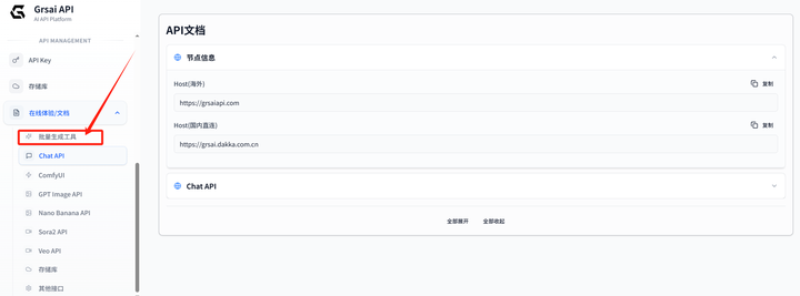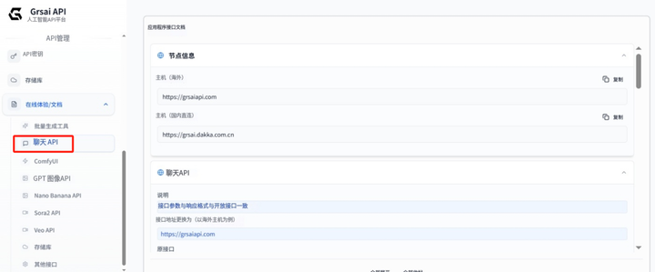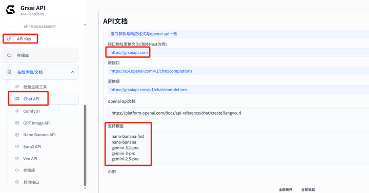 Grsai的Chat API完全兼容OpenAI和Gemini格式,OpenAI只需替换基础地址,Gemini则需要替换基础地址和模型名称即可调用。