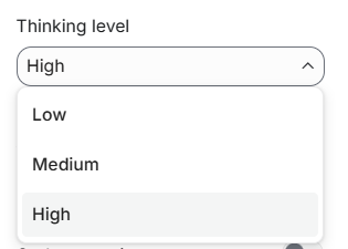 High (高):深度推理模式 (Deep Think Mini),思考Token预算最高,适合专业复杂任务。模型会激活类似“Deep Think”的强大推理引擎,进行极其深入的多步骤思考,以达到最佳效果。虽然成本比中低档位高,但相比上一代的 Deep Think 模式,同等深度下成本降低了约 30%——因为架构优化了,钱花得更值。