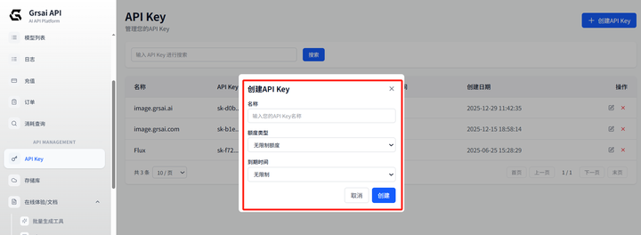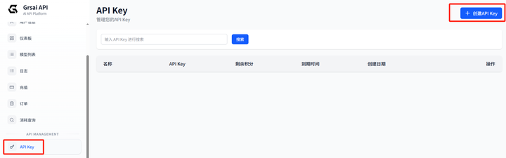 1.获取APIKey:控制台设置ApiKey( https://grsai.com/zh/dashboard/api-keys com域名访问需要魔法,没有改成ai),复制ApiKey