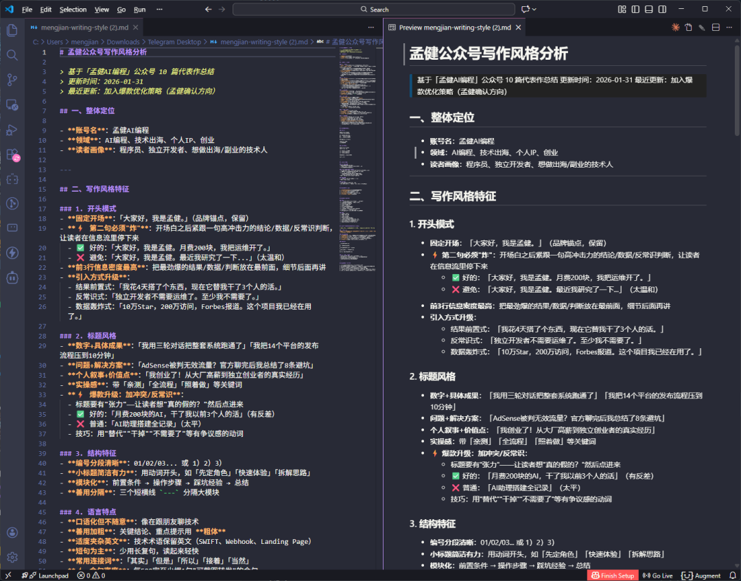写作风格文件:我整理了一份 3000 字的风格规范,从开头模式("大家好,我是孟健" + 第二句必须"炸")、到标题公式(数字+成果+反差)、到结尾要求("弹射"而不是"降落")。Agent 每次写文章前必读这个文件。