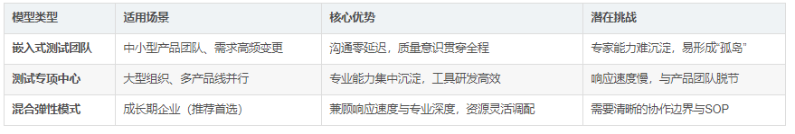 最佳实践:阿里达摩院采用“嵌入+中心”混合模式,核心测试专家下沉至各业务线,同时设立自动化平台组统一维护测试框架,实现效率与质量双提升。