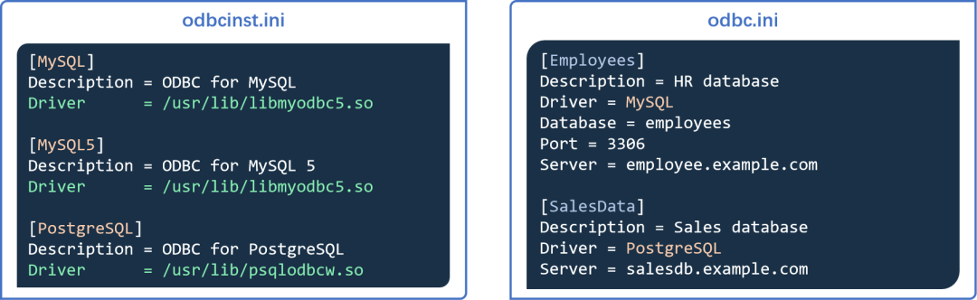 ODBC 驱动及连接配置可通过两个 .ini 文件定义: odbcinst.ini:列出已安装的 ODBC 驱动并定义驱动名称 odbc.ini:基于驱动名称配置数据源 若已在监控项键值中指定连接参数,则可跳过 .ini 文件的配置