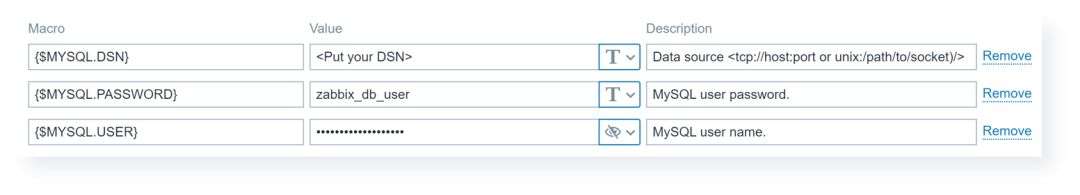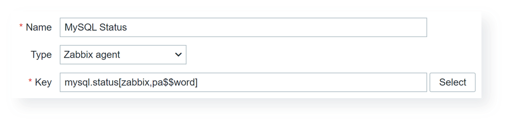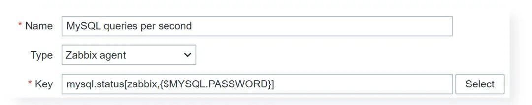 UserParameter=mysql.status[*],mysqladmin status --user=$1 --password=$2