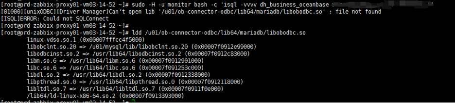 驱动库文件安装在非默认或标准的系统路径中,Zabbix Proxy服务运行用户,对数据库驱动文件没有读权限。 可以通过sudo命令切换用户执行isql命令检查是否正常连接。