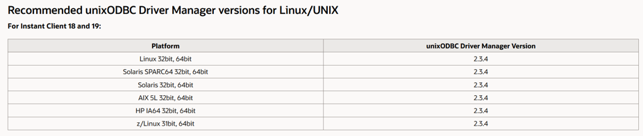 UnixODBC 2.3.9与Oracle 11g驱动器版本不兼容,升级Oracle驱动器版本到Oracle Database Client 18c Oracle Database Client 18c supports "Oracle Database Server is version 11.2.0.4 or later.".