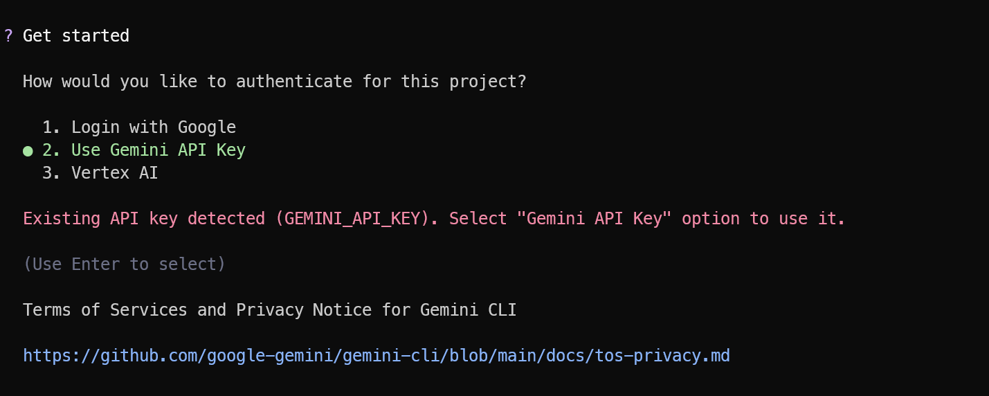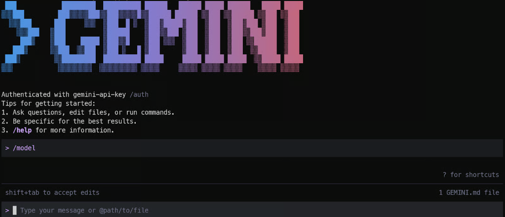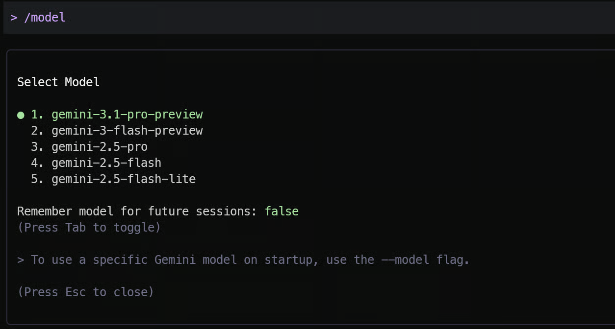 首次启动时,需要使用谷歌账号或API密钥进行 身份验证 。验证完成后,在Gemini CLI中输入“/model”,选择手动模式,然后从列表中选择最新的Gemini 3.1 Pro预览模型。