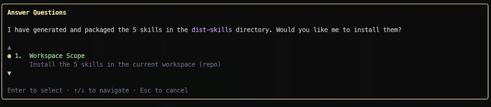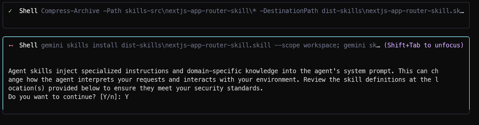 提交指令后,Gemini 3.1 Pro会生成结构化的技能定义,并提示我们进行本地安装。确认安装所有技能后,输入“/skills reload”重新加载技能,再输入“/skills list”验证技能是否添加成功。