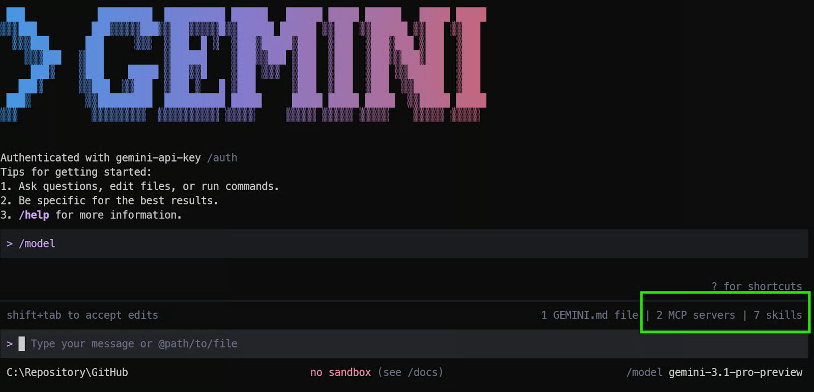 安装完成后,重启Gemini CLI,就可以看到新安装的MCP服务器和技能已经加载到环境中。