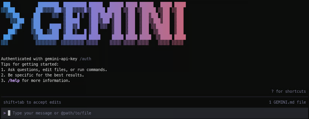 mkdir geek-matchcd geek-match......# 此处省略了文件夹初始化和git配置代码然后启动Gemini CLI:
