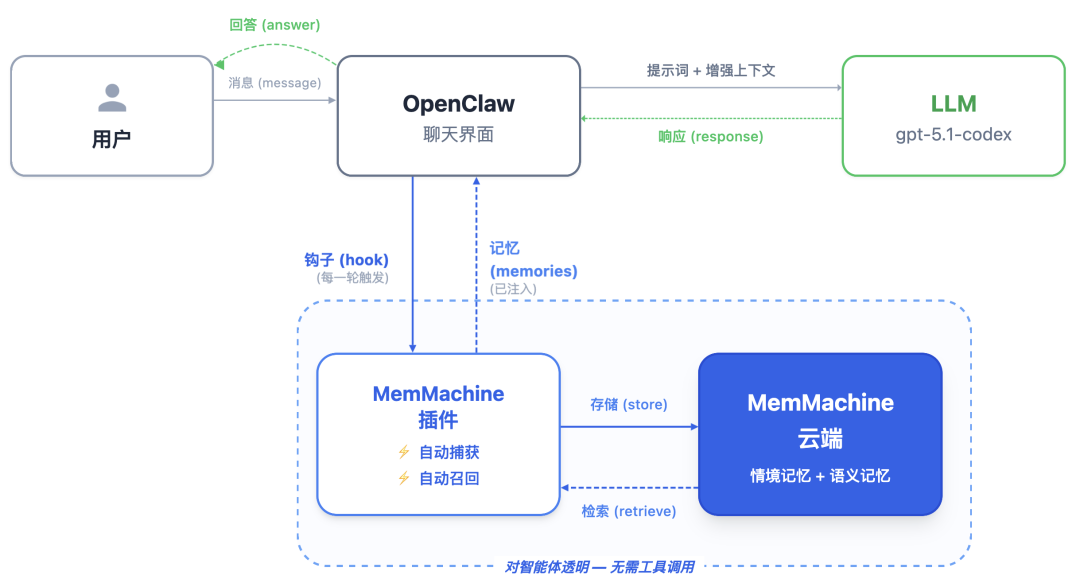 与其他很多软件相似,OpenClaw 具有“钩子”(Hook)的扩展机制,技术的语言来说类似于“中断处理”,可在 OpenClaw 处理消息的关键路径上“埋点”。MemMachine 借此实现非侵入式的功能增强,不改一行 OpenClaw 的源码,却能彻底改变它的记忆能力。