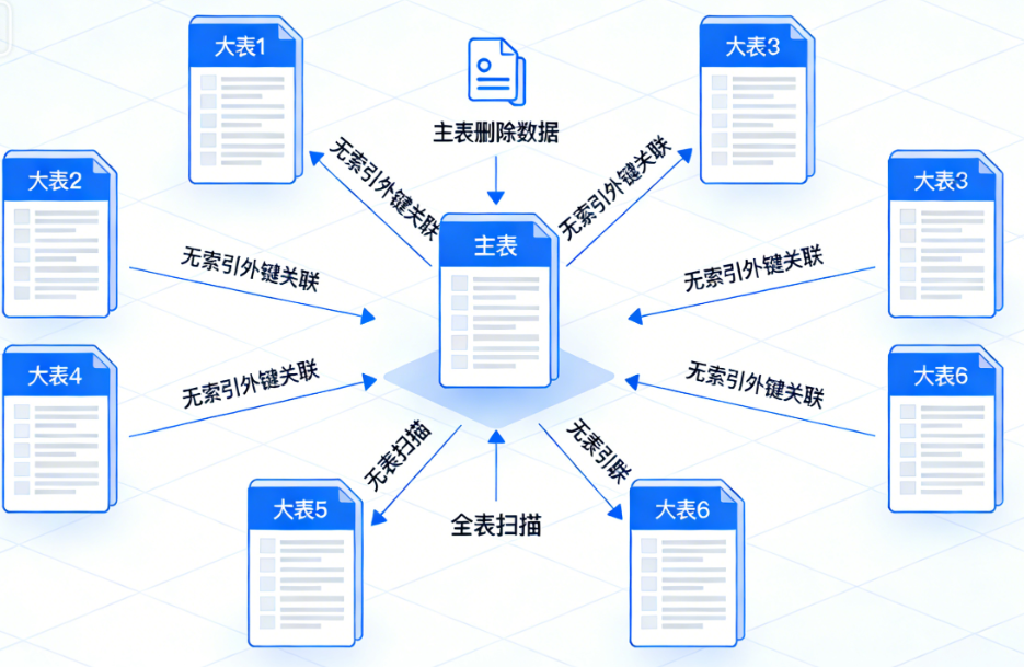 补充说明:经过业务确认,这6张外键关联表的数据无需跟随主表删除(即外键仅用于关联查询,不涉及级联删除),这也为我们后续解决问题提供了前提。
