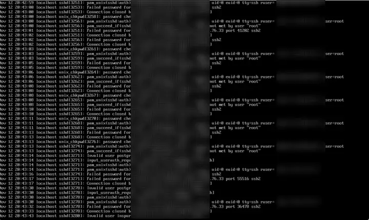 登录目标服务器调取系统及服务日志,获取关键佐证: 从SSH登录日志可见,多个境外IP(如139.xxx.xx.33、8.xxx.xx.235等)在短时间内发起高频SSH暴力破解尝试,多次尝试破解root、postgres等常见账号密码,大量登录请求因认证失败被拒绝,与抓包分析结果完全吻合