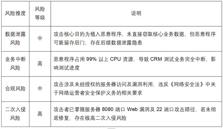 2、网络拦截:开启防火墙,仅放行8080-8089端口、SSH 22端口及443 nginx代理端口的访问;临时关闭8080端口公网访问权限,仅开放内部测试IP段访问,避免二次攻击。 长期加固措施 1、SSH服务加固: 禁用密码认证,强制启用SSH密钥对认证,密钥文件权限设置为chmod 600 ~/.ssh/id_rsa;修改/etc/ssh/sshd_config配置文件,设置PermitRootLogin no(禁止root直接登录)、MaxAuthTries 3(限制认证尝试次数)、AllowUsers test01(仅允许指定测试用户登录)。 2、漏洞防护强化: 针对性修补8080端口Web漏洞,关闭不必要的服务与端口,消除攻击入口。 3、监控体系优化: 在NetInside系统中进一步强化对目标服务器的多维度监测与智能告警机制,提升异常行为识别灵敏度。 八、结论 本次事件是一起典型的Web漏洞入侵+SSH暴力破解协同攻击事件,攻击者通过目标服务器8080端口Web漏洞发送加密Payload,成功植入恶意挖矿程序,同时通过多个恶意IP发起高强度SSH暴力破解,形成“双路径攻击”态势。 通过NetInside网络流量分析系统率先捕捉流量异常,进行数据流追踪、服务器日志核查及危险情报关联,我们已完整还原攻击过程,高效完成漏洞修复、恶意清理及安全加固等全流程处置工作,目前服务器已恢复正常运行,CRM测试业务稳步推进。 后续建议用户持续优化安全监控策略,定期开展安全排查,强化测试环境的安全防护能力,有效抵御同类攻击事件。 END