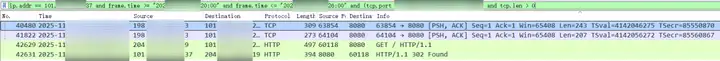 拆解双路径攻击逻辑 1、8080端口Web攻击流量分析 通过设置过滤条件 (ip.addr == 101.xxx.xxx.237 && tcp.port == 8080),筛选出目标服务器8080端口流量并深度分析: ● 攻击源IP:198.xxx.xx.213 ● 端口特征:源端口为高位随机端口(63854、64104),目的端口固定为8080 ● 流量细节:攻击流量为加密TCP报文,包含[PSH, ACK]标记,两次核心攻击报文数据长度分别为243字节和207字节,属于Web漏洞攻击的恶意Payload传输行为。