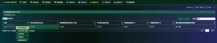 2、流量深度分析与数据包采集 通过NetInside系统主机数据分析功能开展以下操作: 定位目标主机数据:筛选攻击时段目标主机数据,吞吐量(总和)61.417kbps、失败数(接收)20731个,明确该时段存在高频失败与异常流量特征。